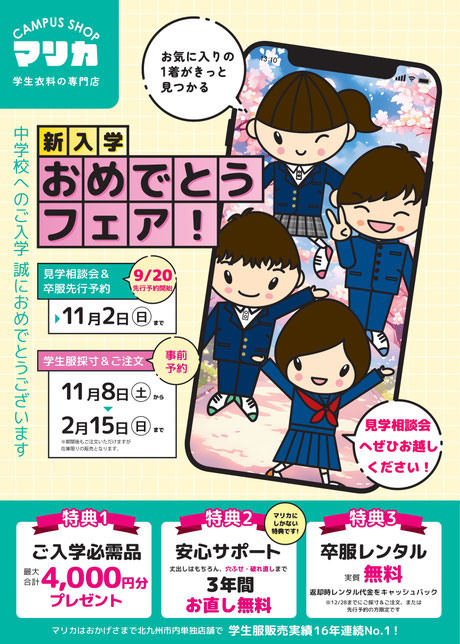 学生服のご予約で、好みのセットや柄、サイズをいち早くおさえることができます。たくさんご用意していますのでお好みのものをお選びいただけます!