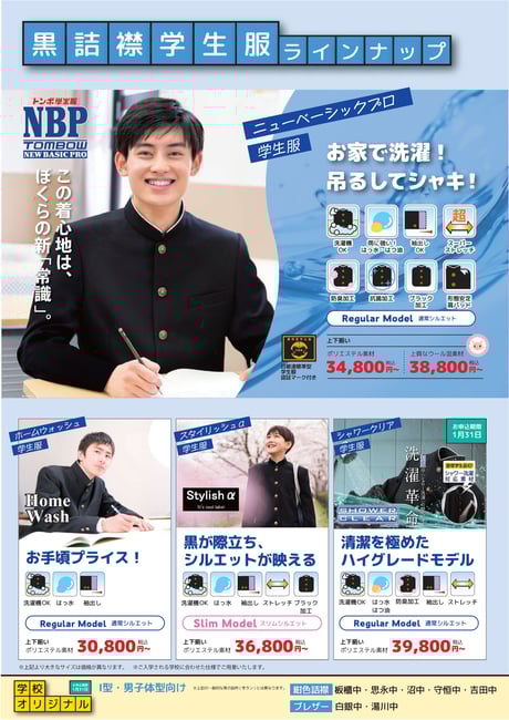 従来型シルエットの詰衿学生服を3種類ご用意しています。