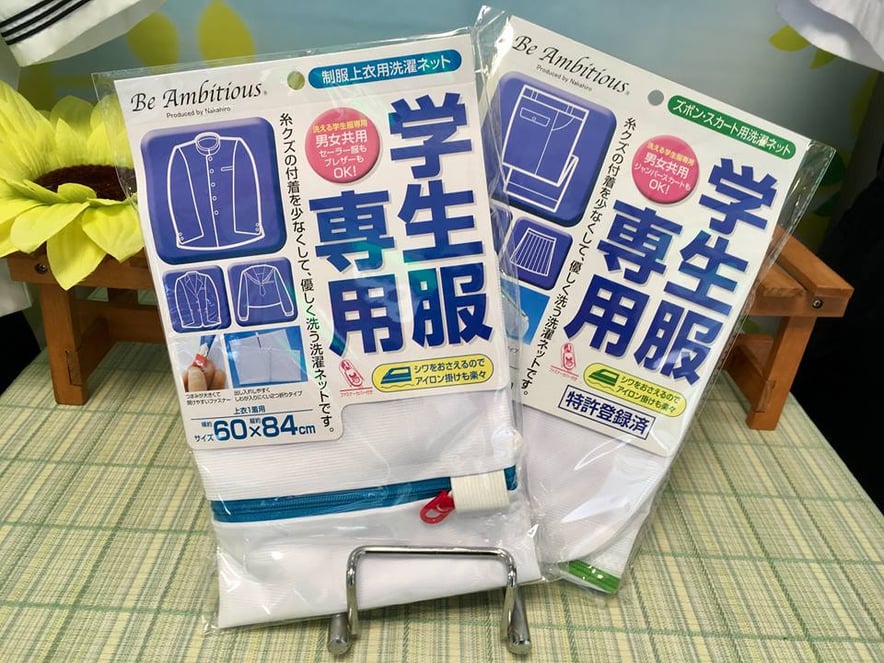 当店では学生服専用の洗濯ネットも販売しています。上衣用と下衣用に分かれていて、とっても便利とお客様にもご好評いただいています。