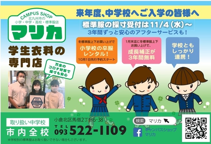 今年度は店内混雑回避のため、11月4日(水)よりR3年度新入生のかたの採寸をスタートいたします。